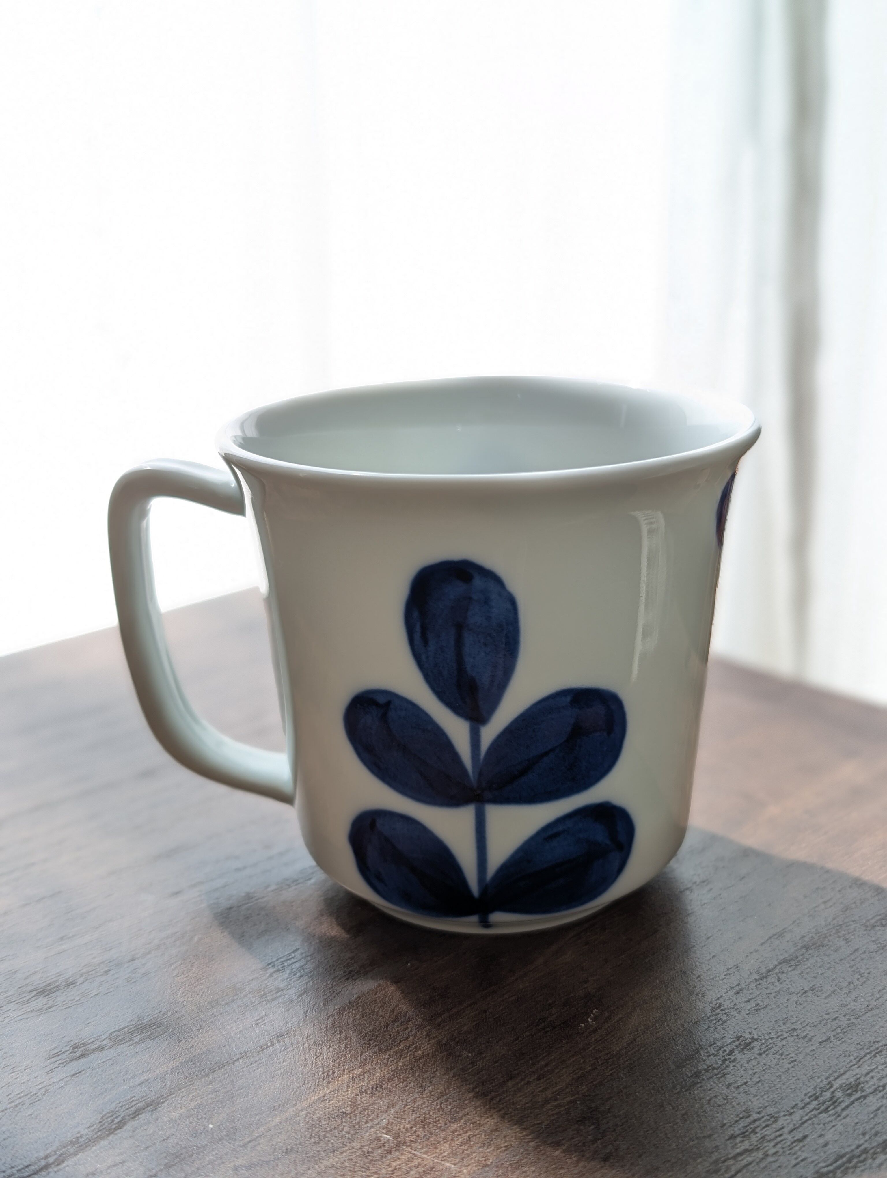 有田焼らしい滑らかな白磁に、大胆にボタニカル柄を描いたマグカップ。職人さんにより、一つ一つ心を込めて丁寧に絵付けしてあります。