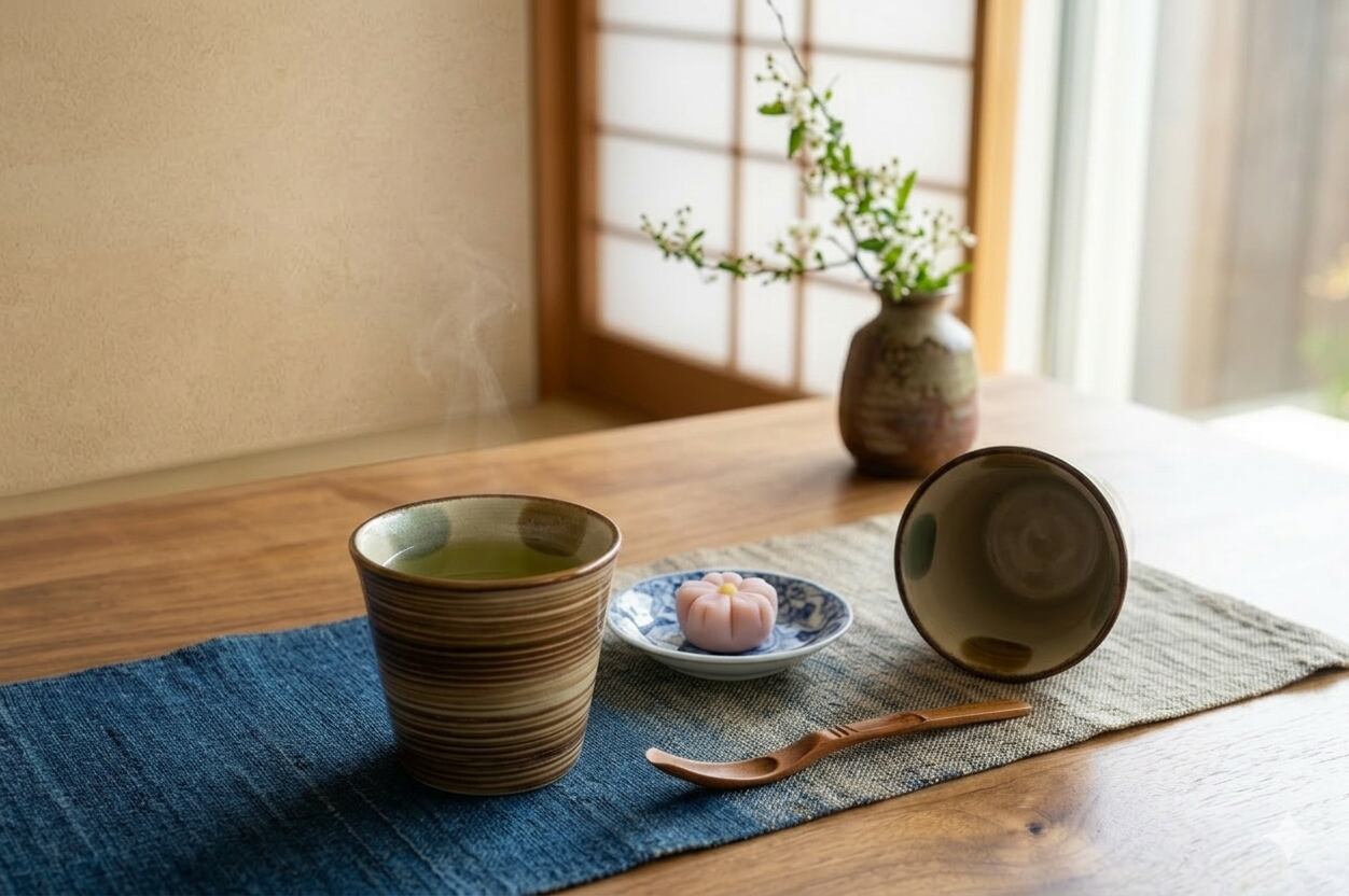 素地の柔らかな色に淡い水色と茶色の模様がフチに並び、なんとも優しい雰囲気。